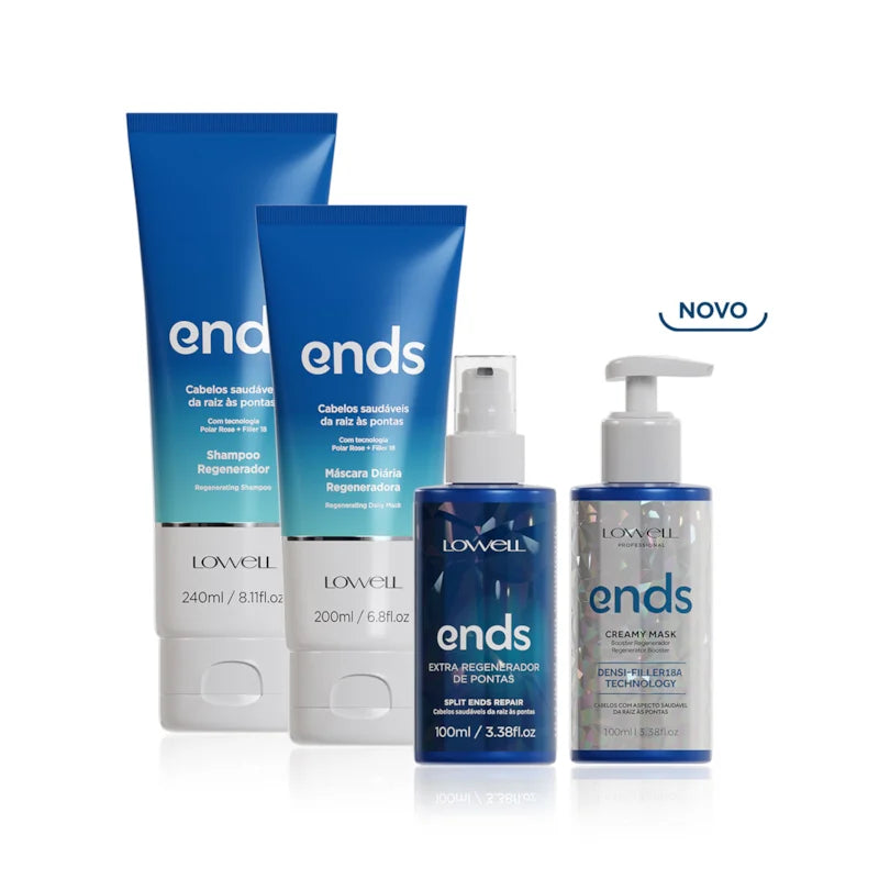 Após lavar o cabelo com o shampoo, aplique a máscara e deixe agir por 5 minutos. Evite a raiz. Enxágue e finalize com o Extra Regenerador de Pontas Lowell Ends.